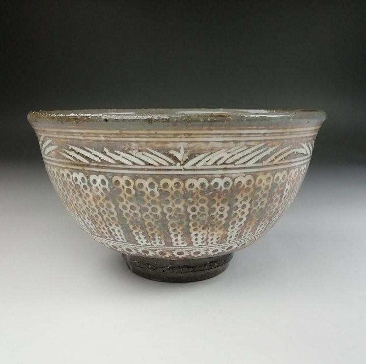 ・外側は「雨垂れ三嶋」と呼ばれる細かな点文様をはじめ、櫛目模様、草葉、花文様を刻印と象嵌で表現。