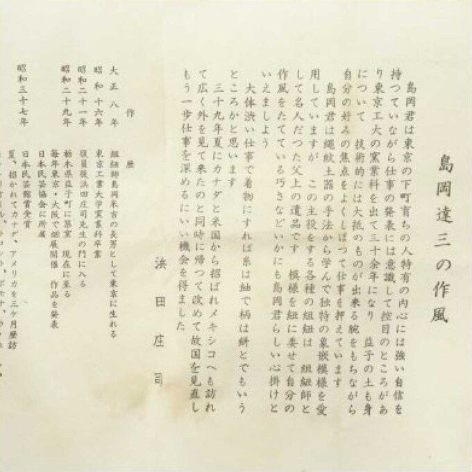濱田庄司に師事し、民藝運動の流れを汲みながらも、島岡ならではの現代性を感じさせる作品となっています。