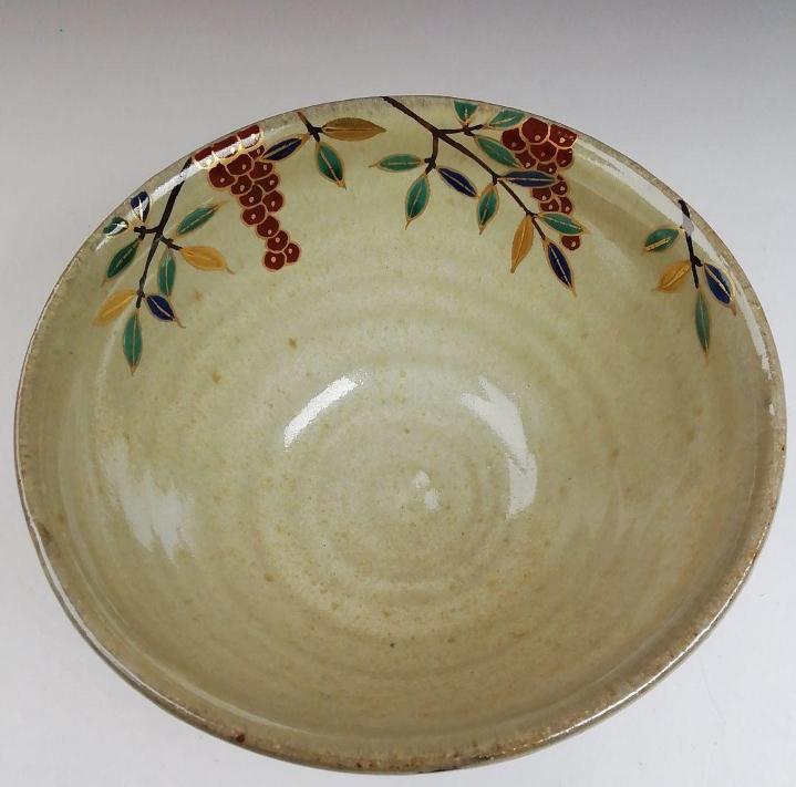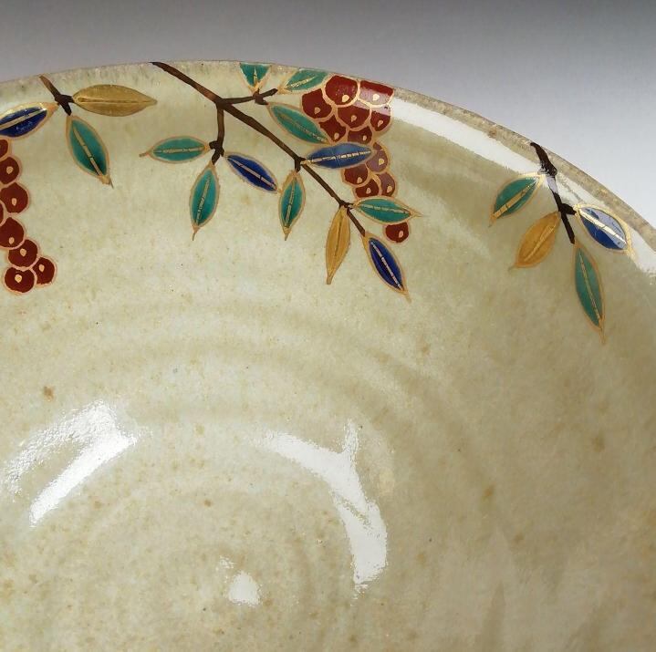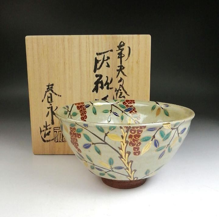 加藤春栄 灰釉 南天文 抹茶碗|京焼|縁起物 茶碗|共箱付