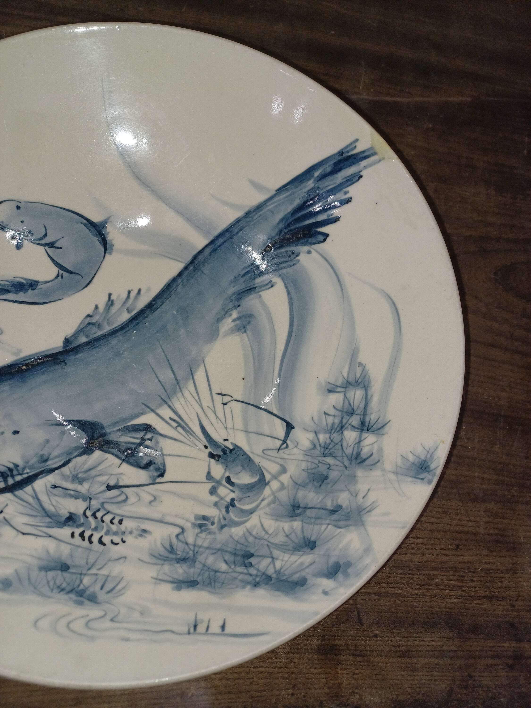 呉須による力強い筆致で、鯰(なまず)・海老・水草が描かれており、水中の躍動感が見事に表現されています。