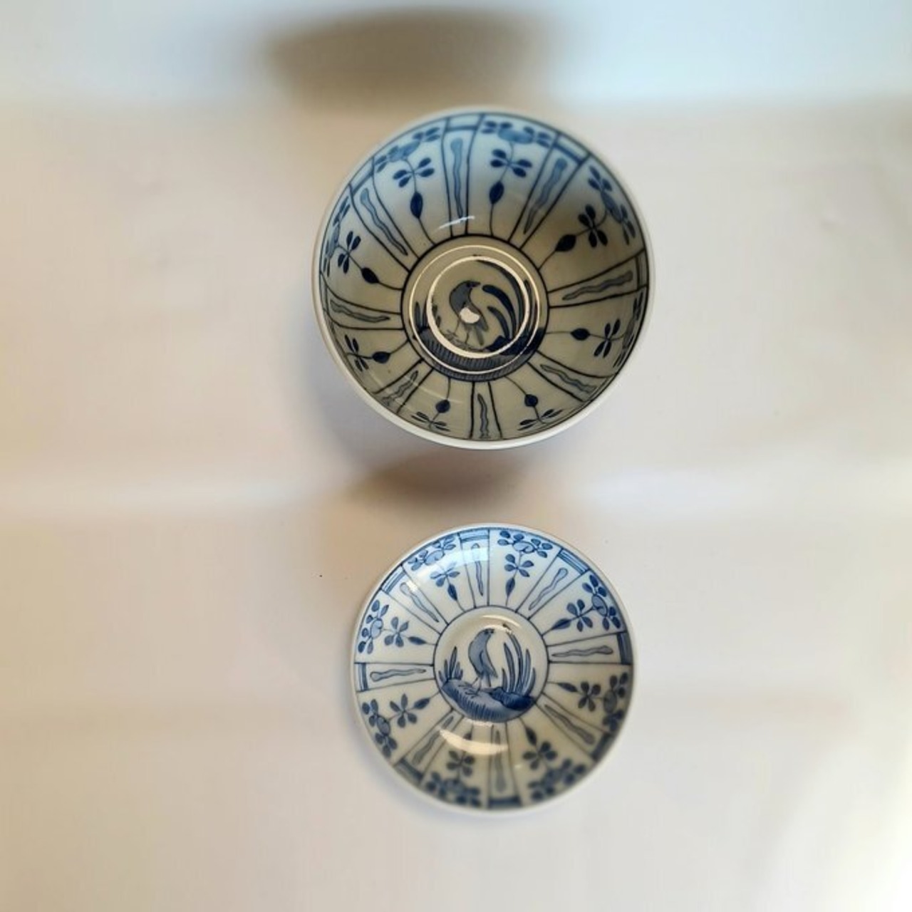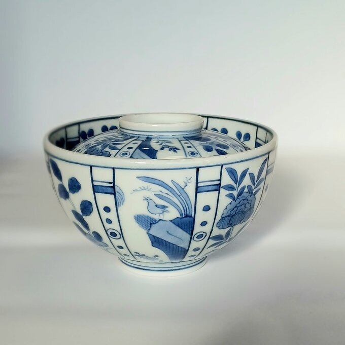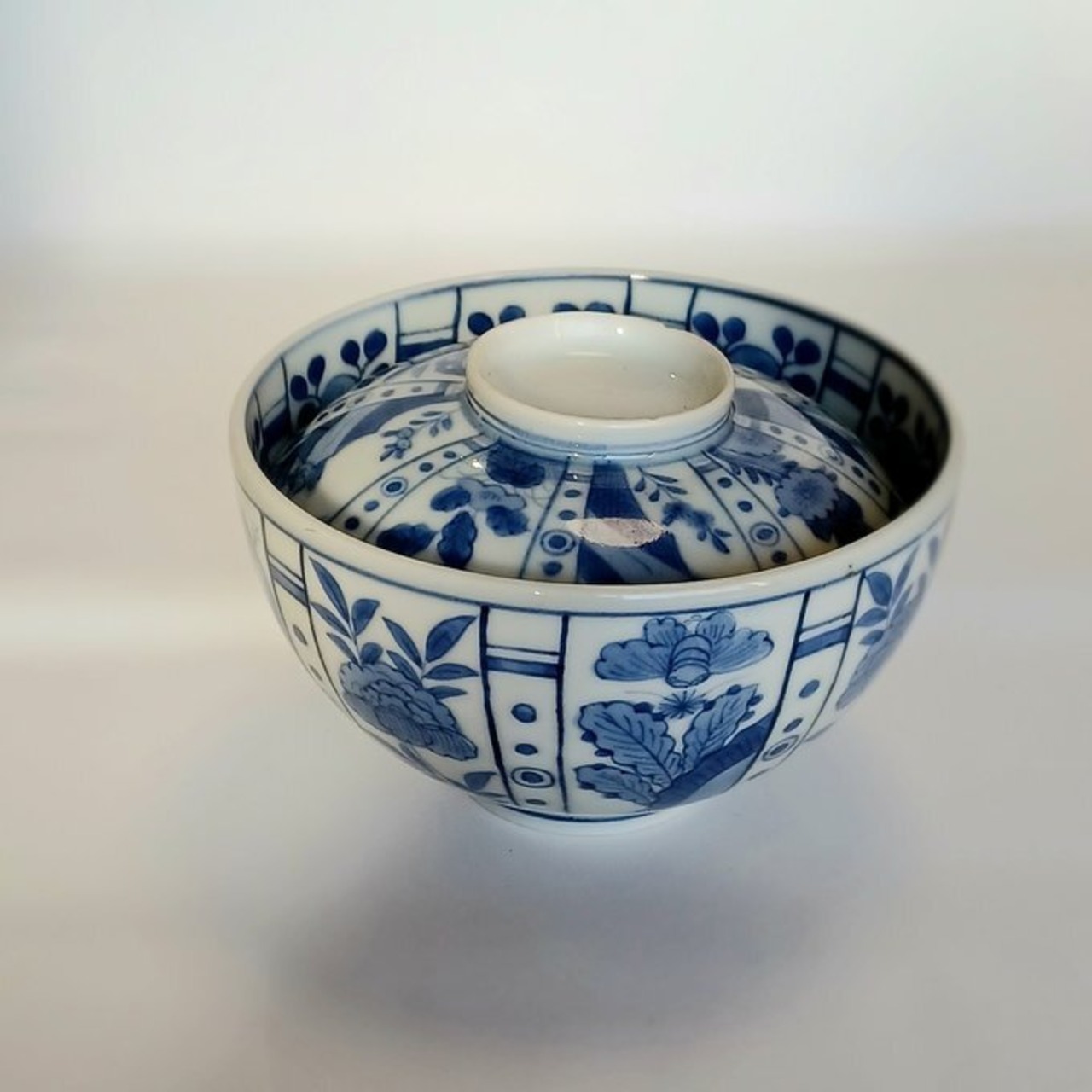 品の良い図柄とすっきりした姿の蓋付き碗です。