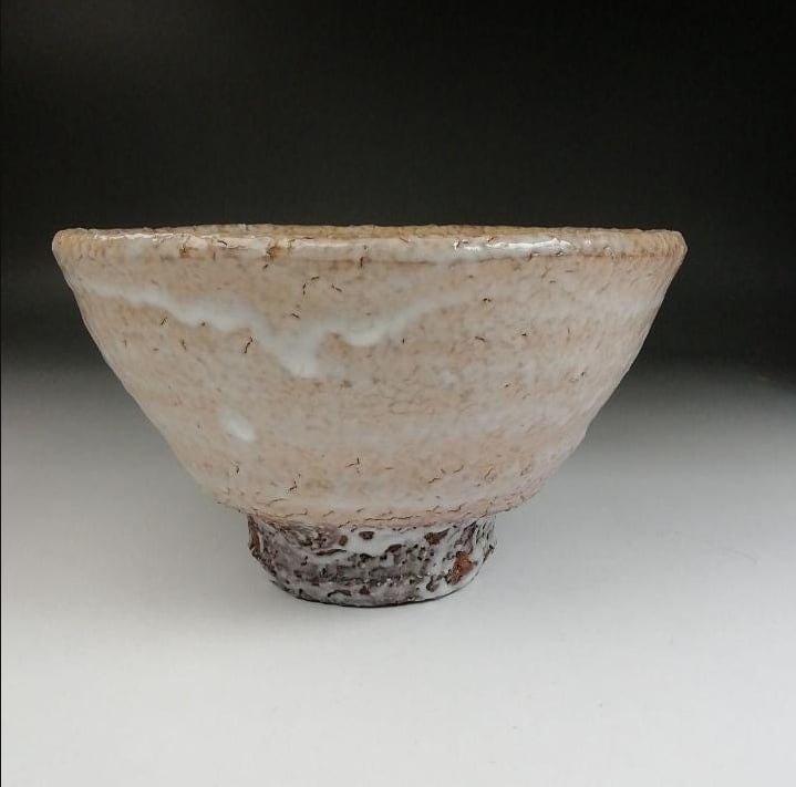 井戸茶碗を思わせる骨太な造形と、雪のように白い釉景色が特徴です。