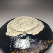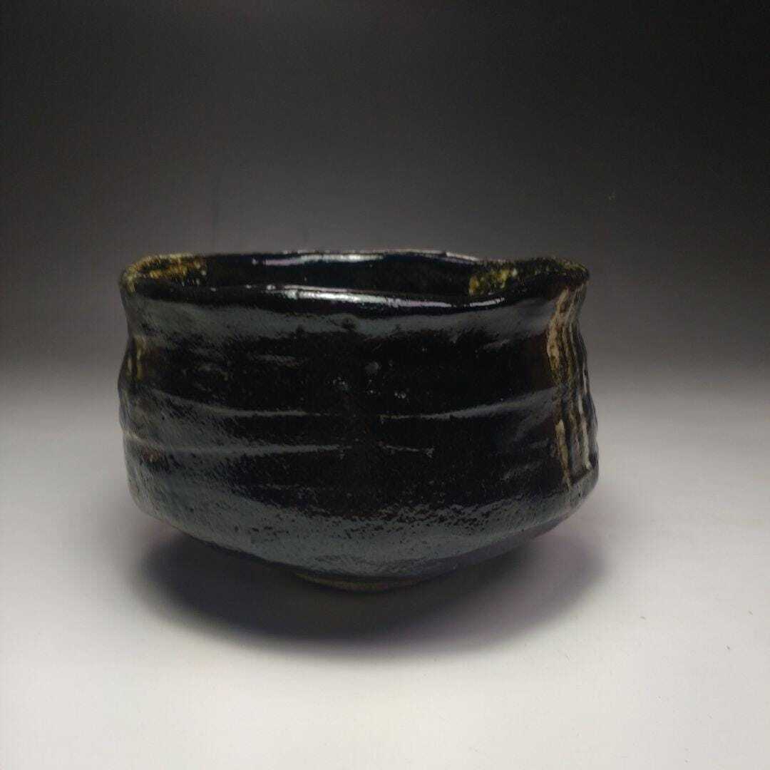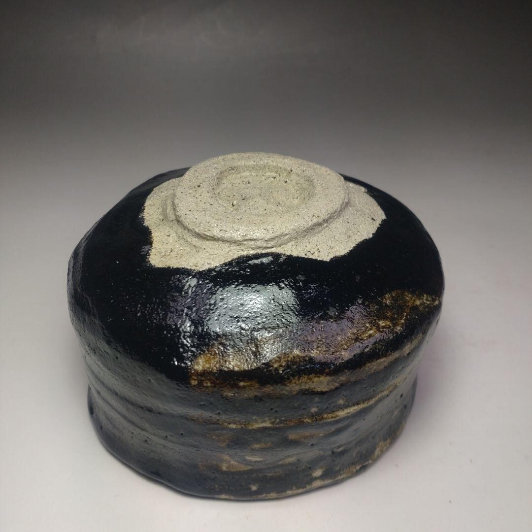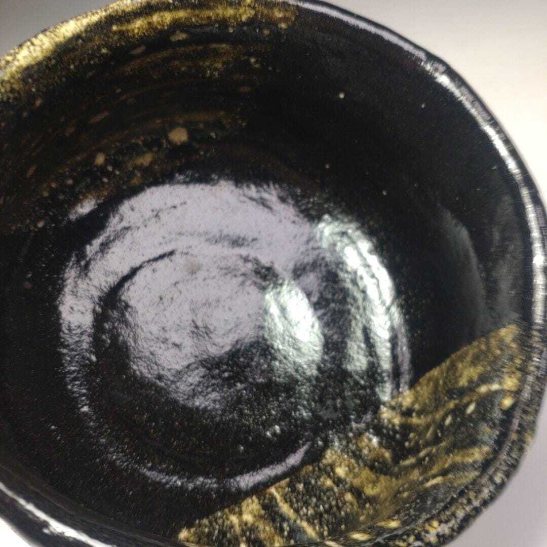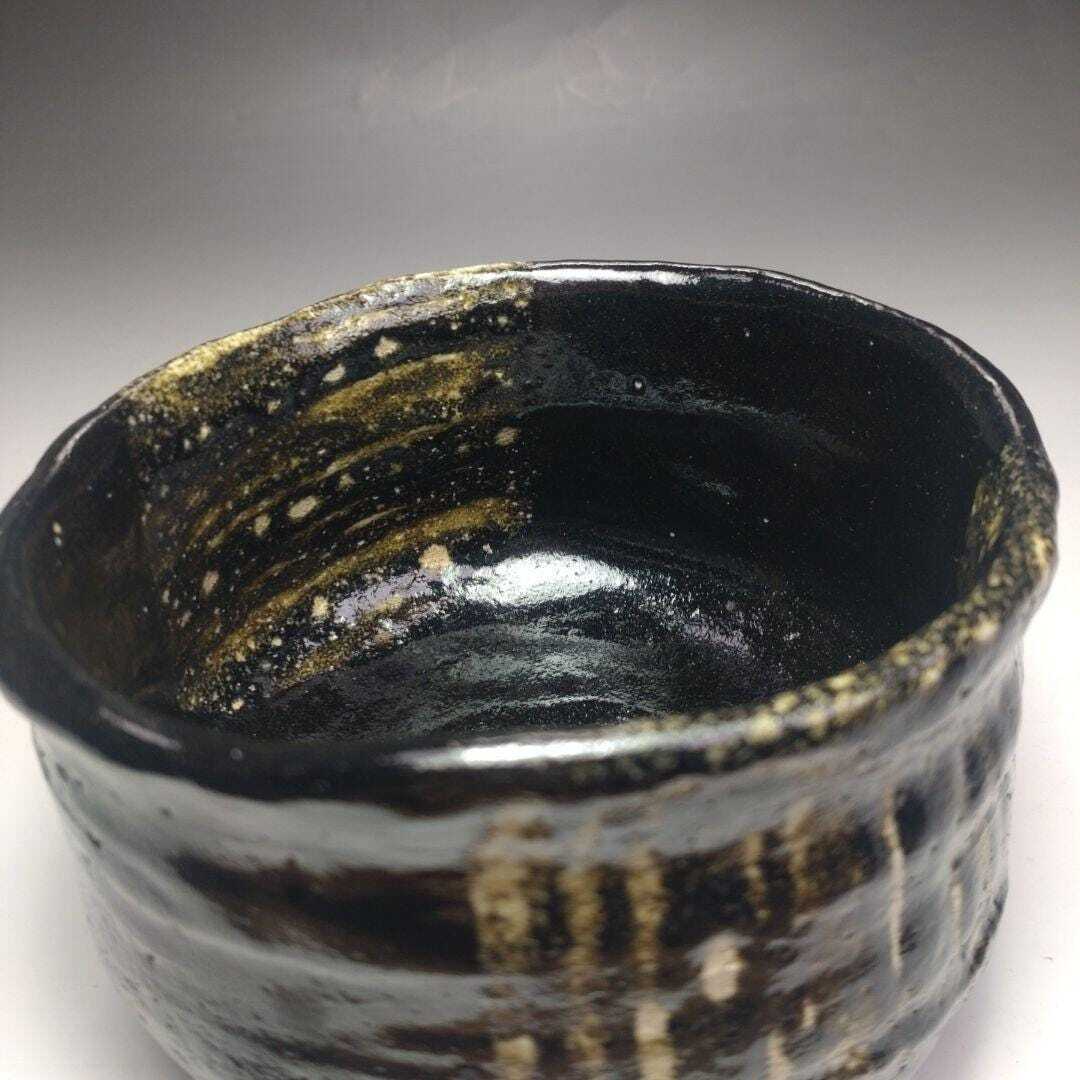黒織部特有の艶やかな黒釉を基調とし、釉の薄い部分には褐色や金味が現れ、窯変による奥行きある景色を形成。