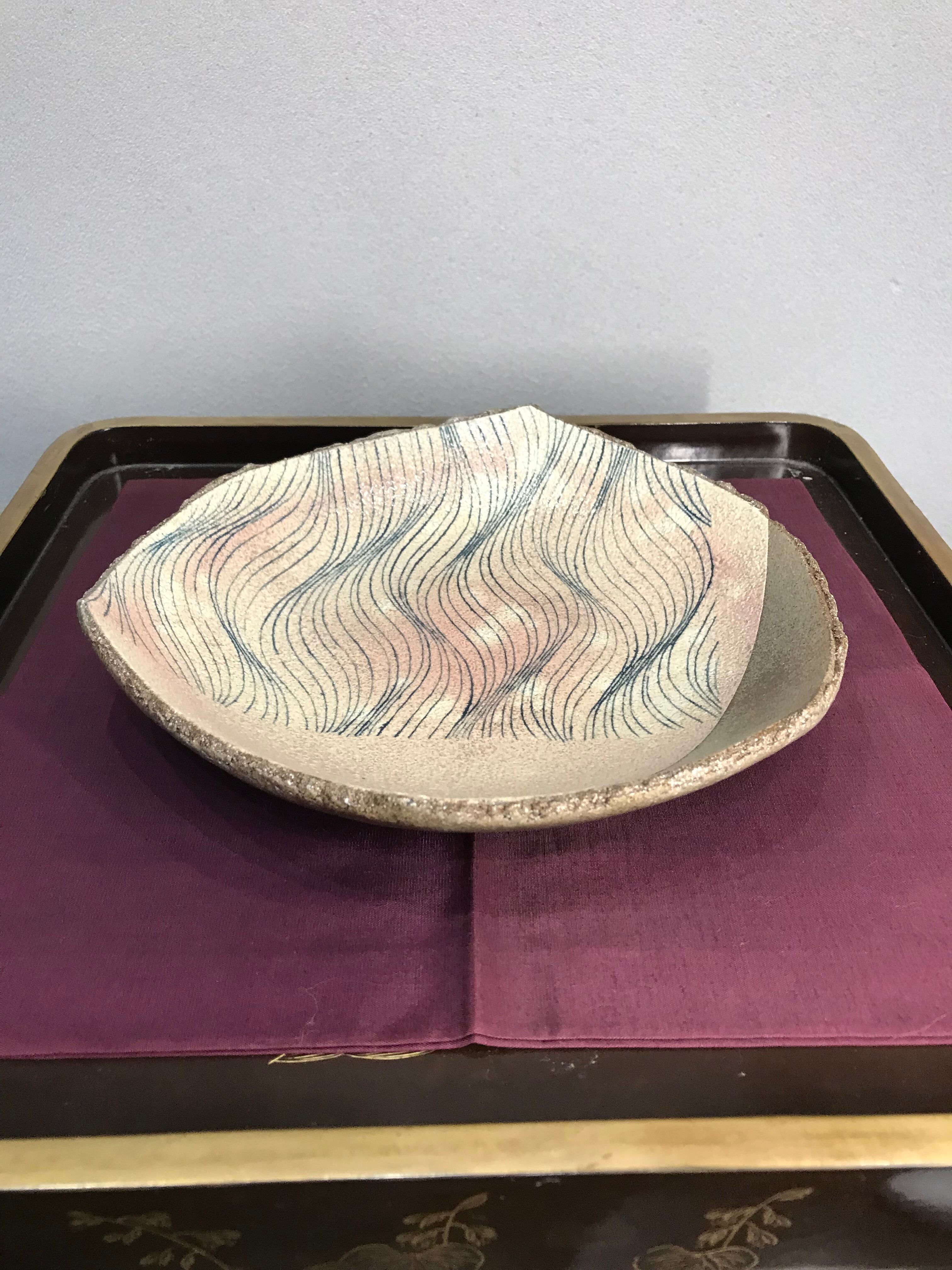 細やかな波文を彫り込み、呉須を入れて表現したモダンな意匠が特徴。変形皿ならではの独特なフォルムが、食卓や空間に存在感を与えます。