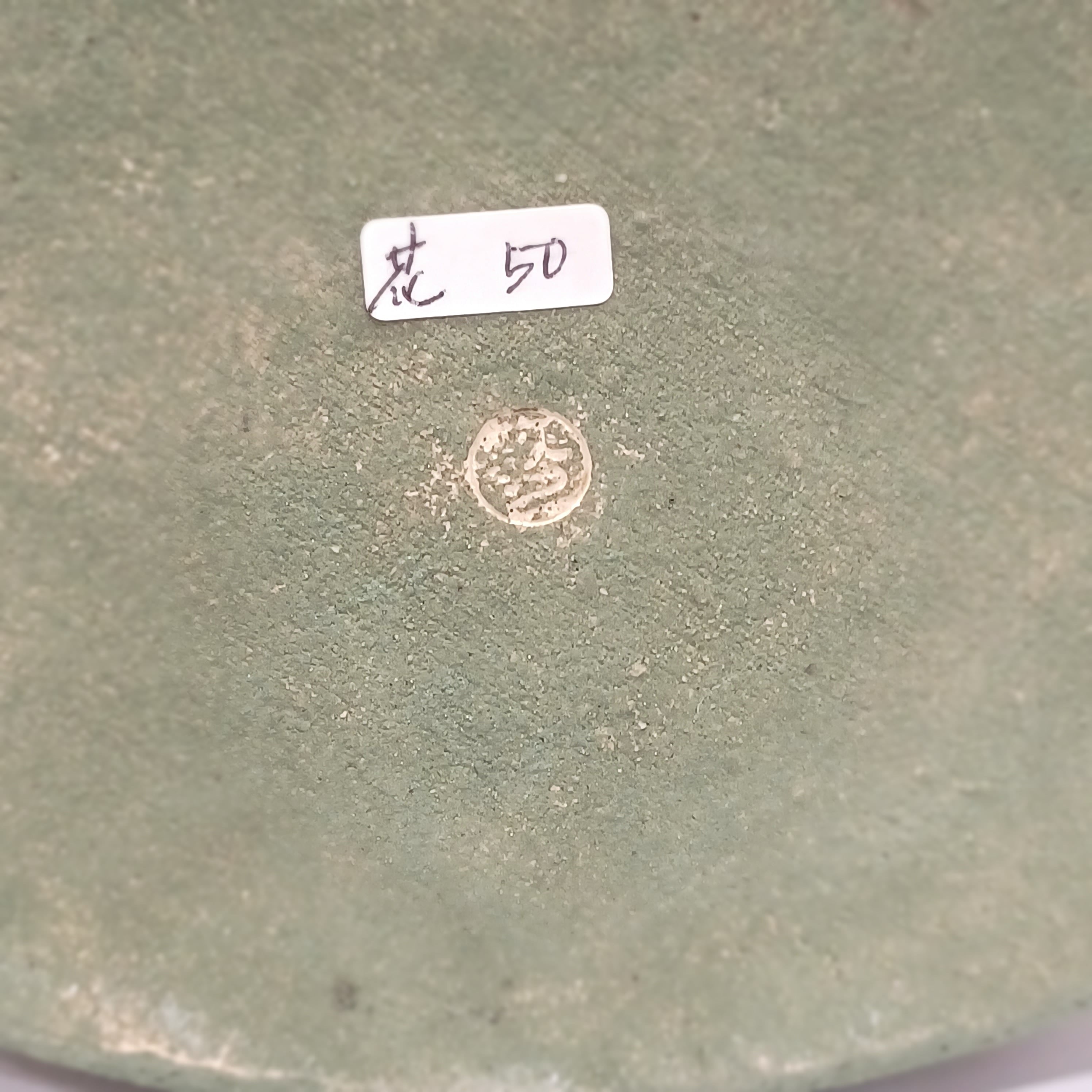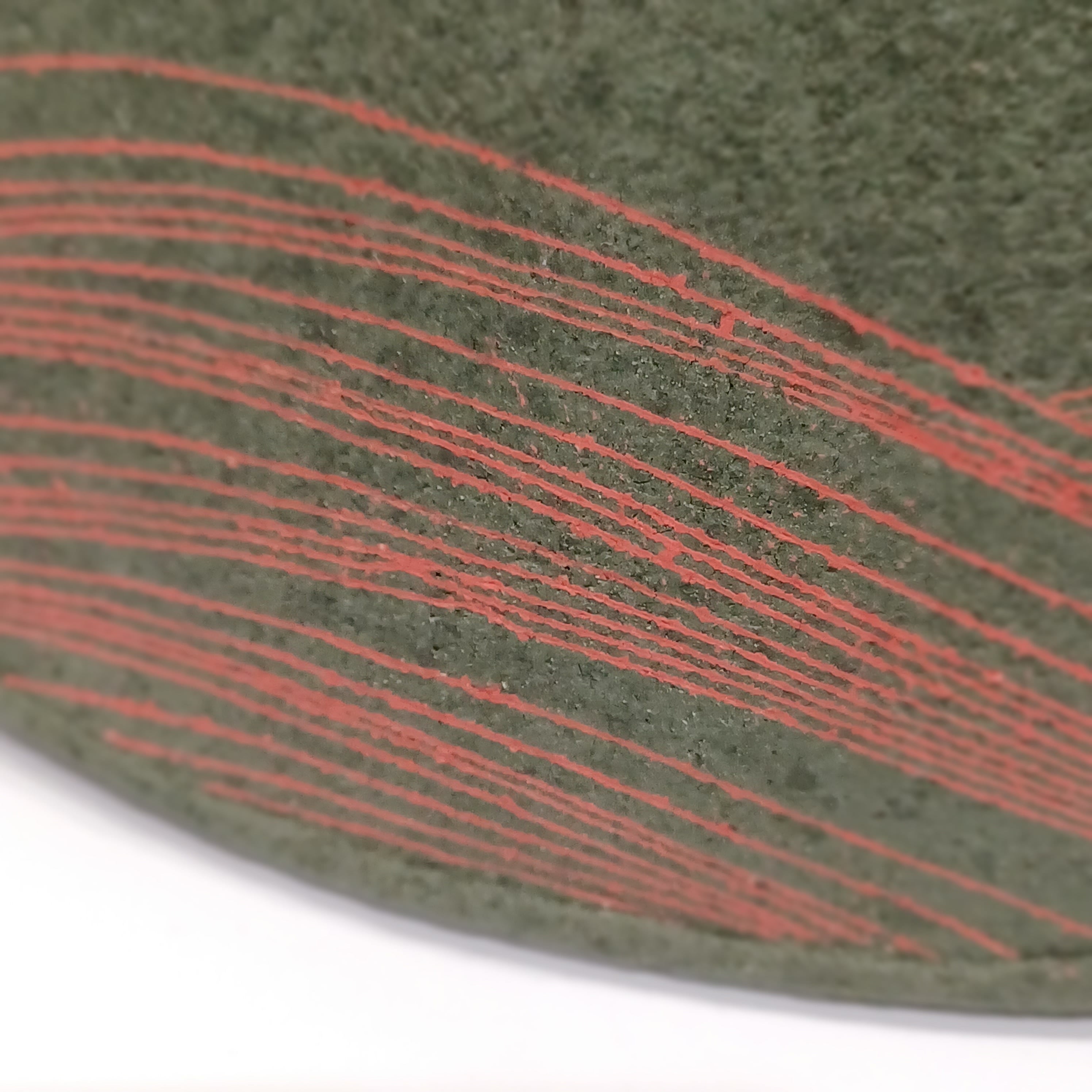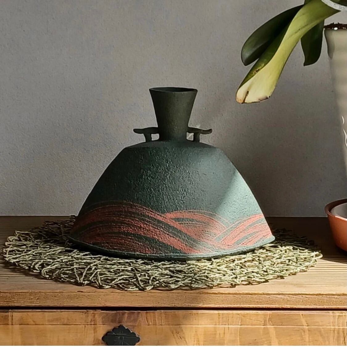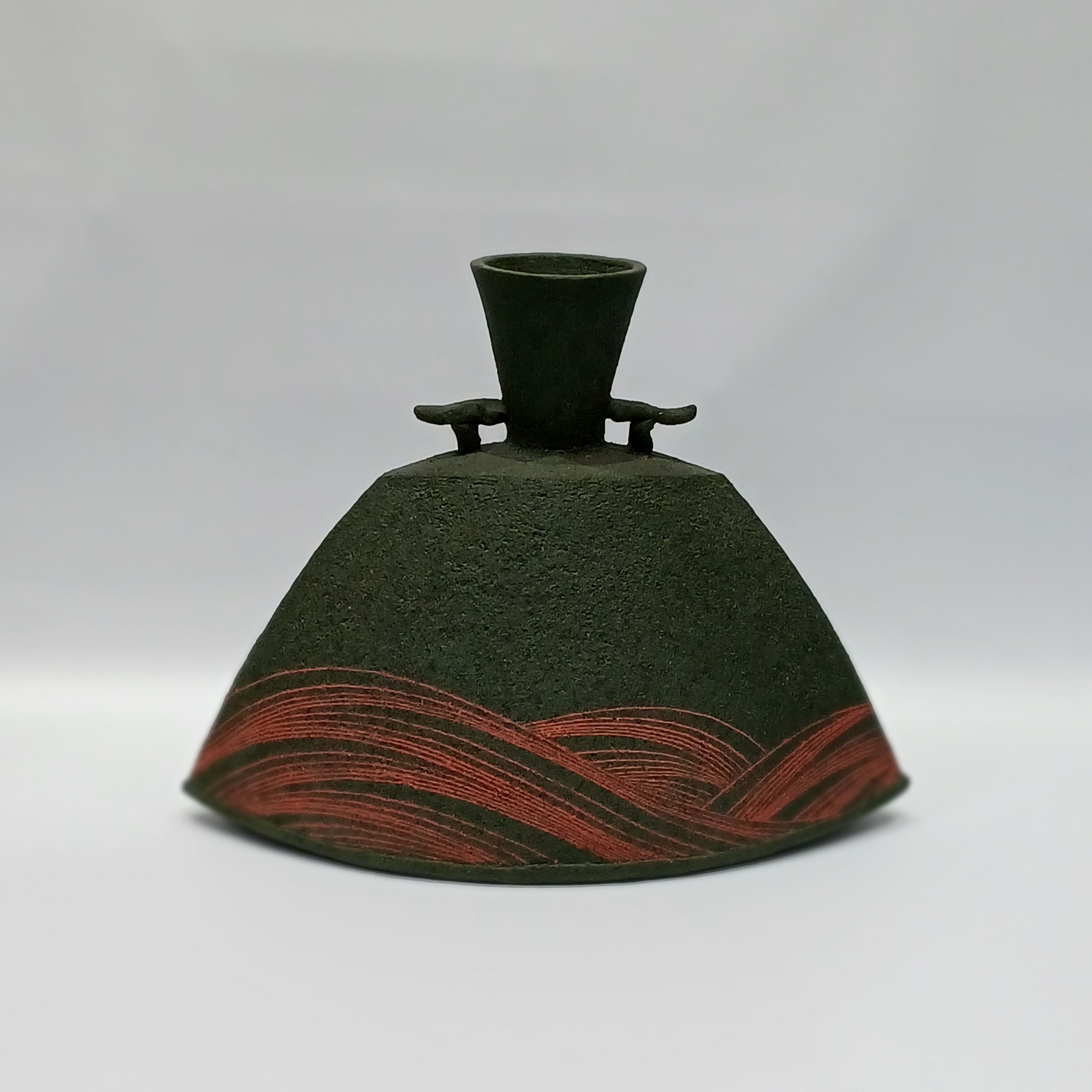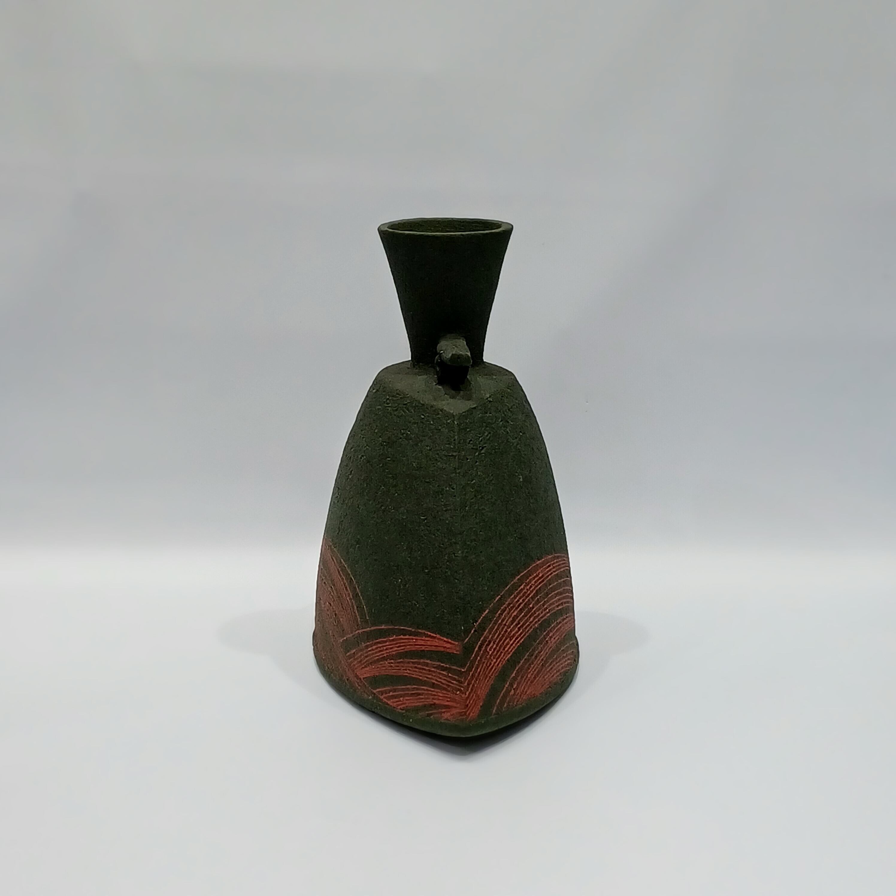 The painted decorative wavy line engraved flower vase is an original work by Hagiyaki artist Atsuyuki Ueda. A new green glaze is used throughout, creating a gorgeous spread of beautiful green. The bottom part is carved with wavy lines and red glaze is applied to express the dynamic waves. It is recommended not only for arranging flowers, but also as an accent for interior decoration.