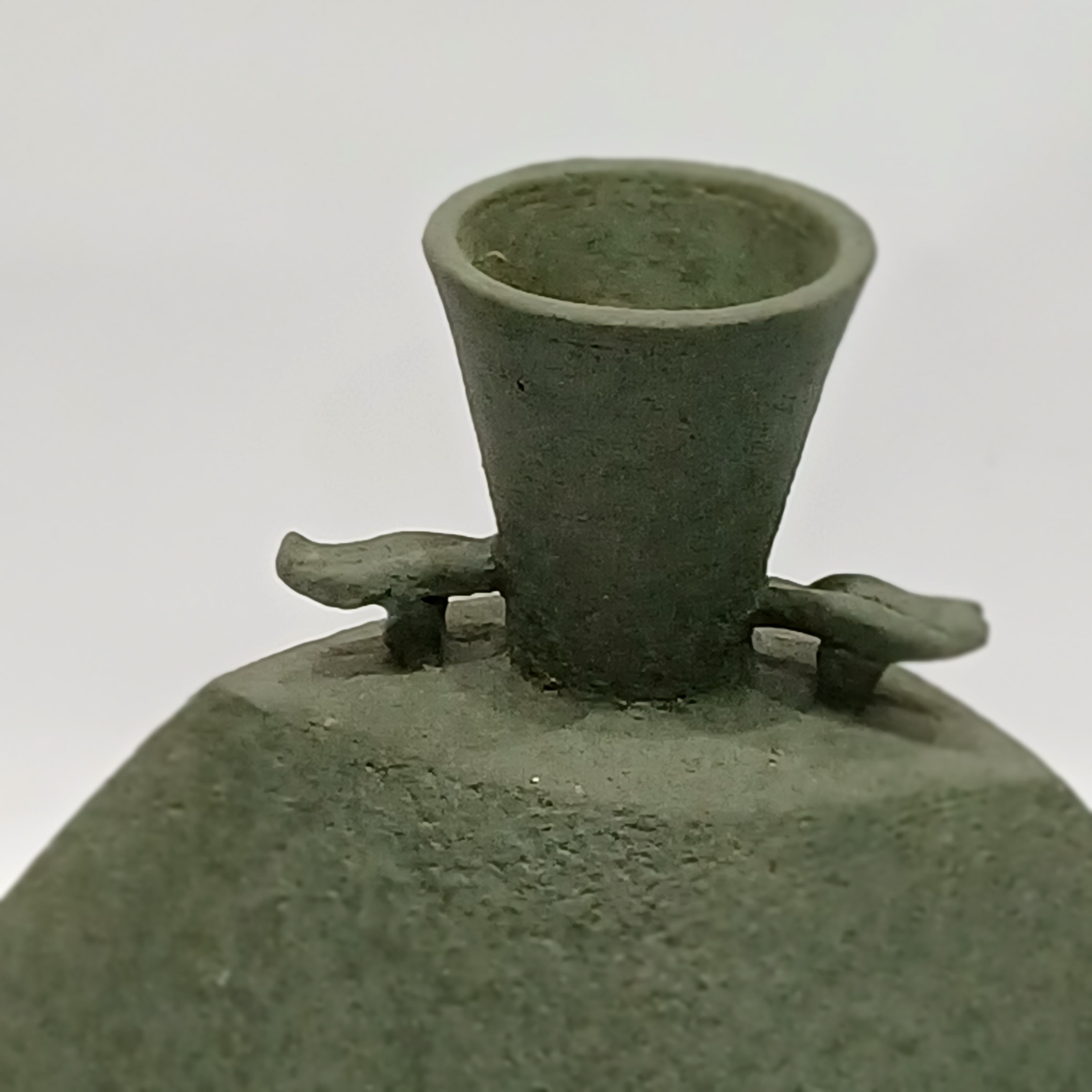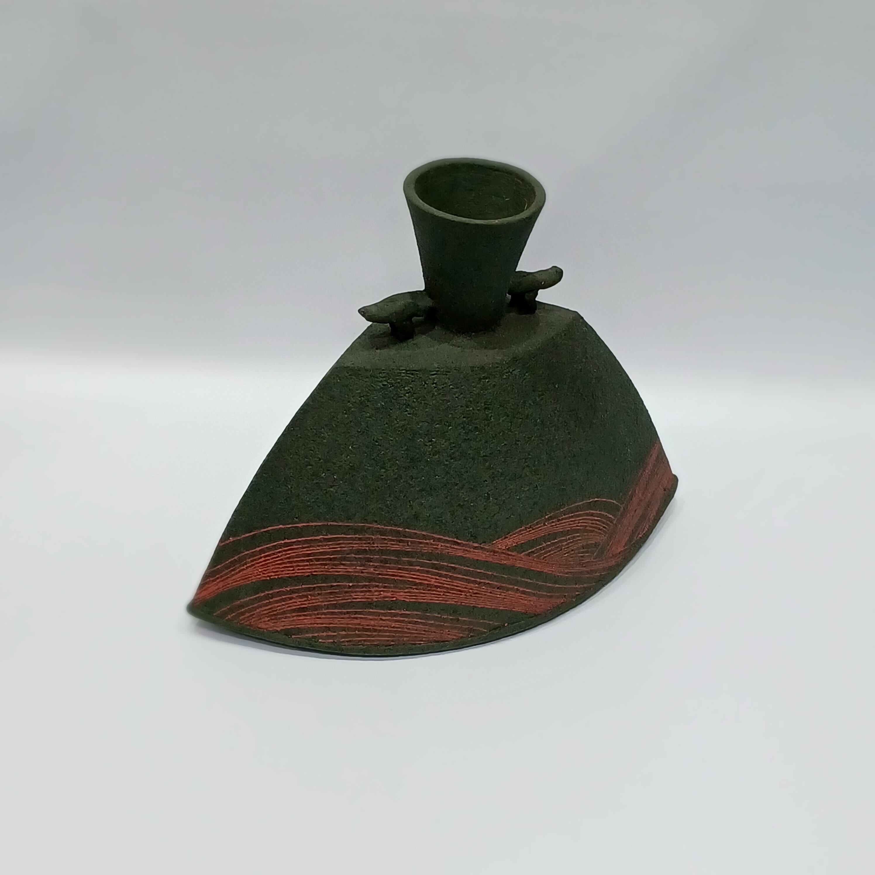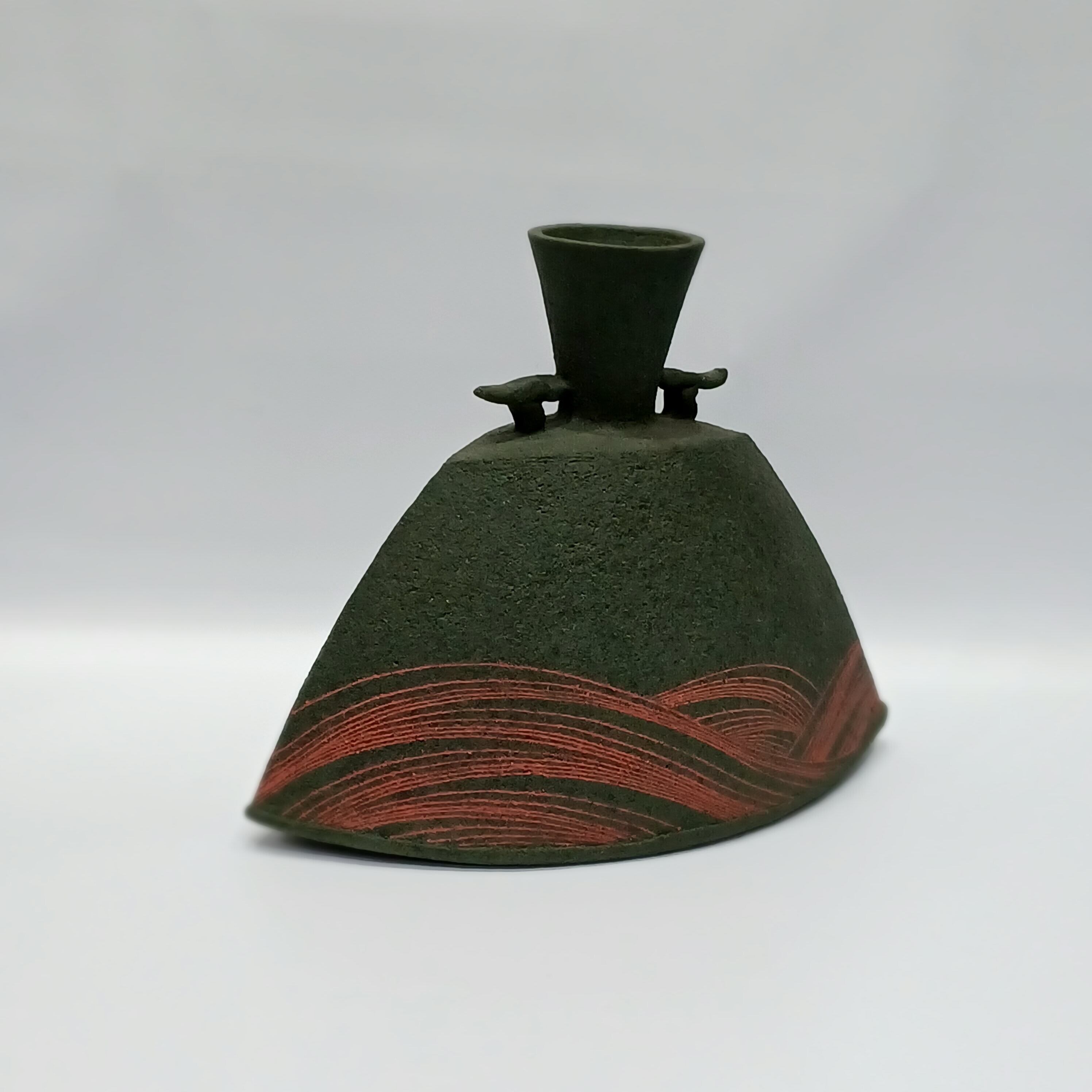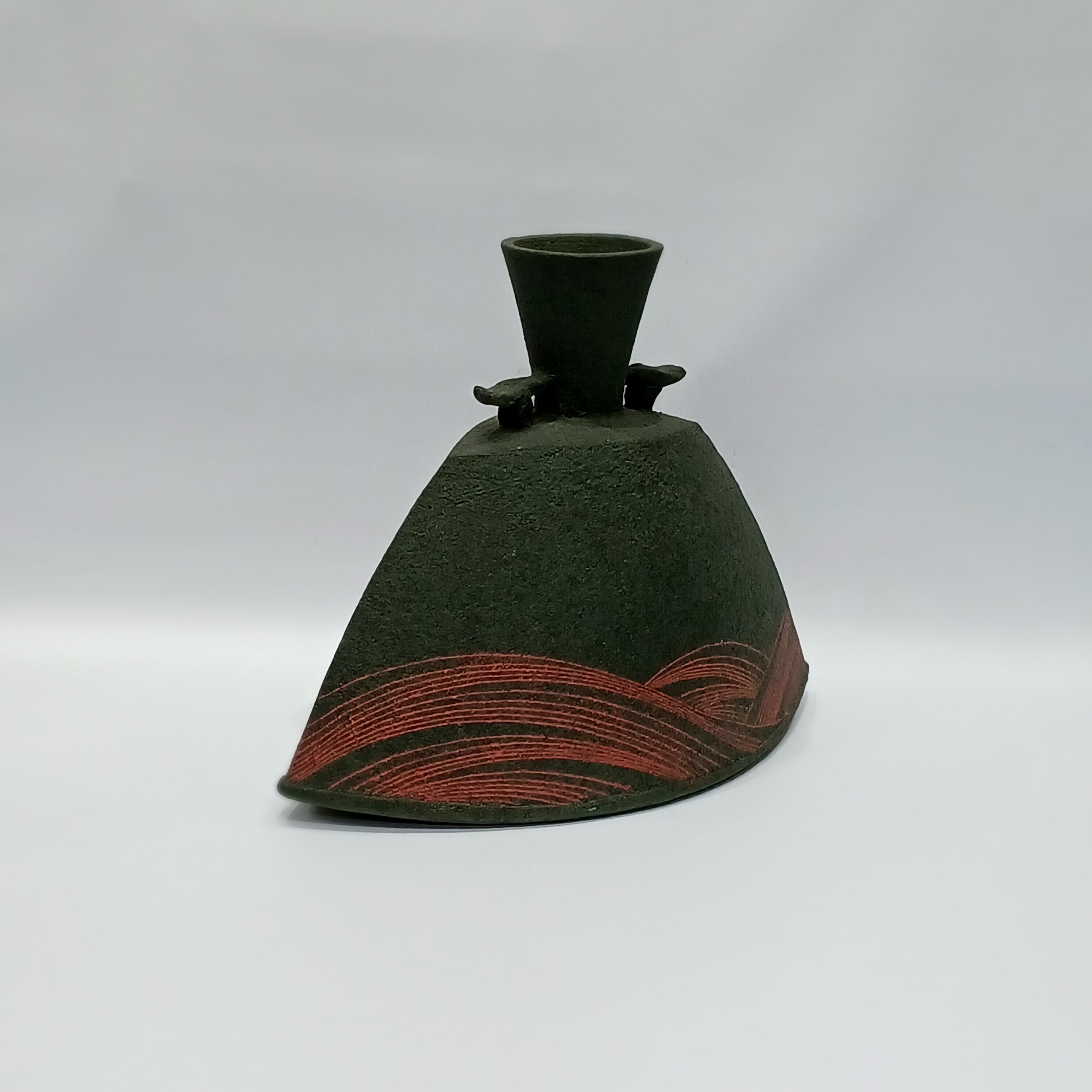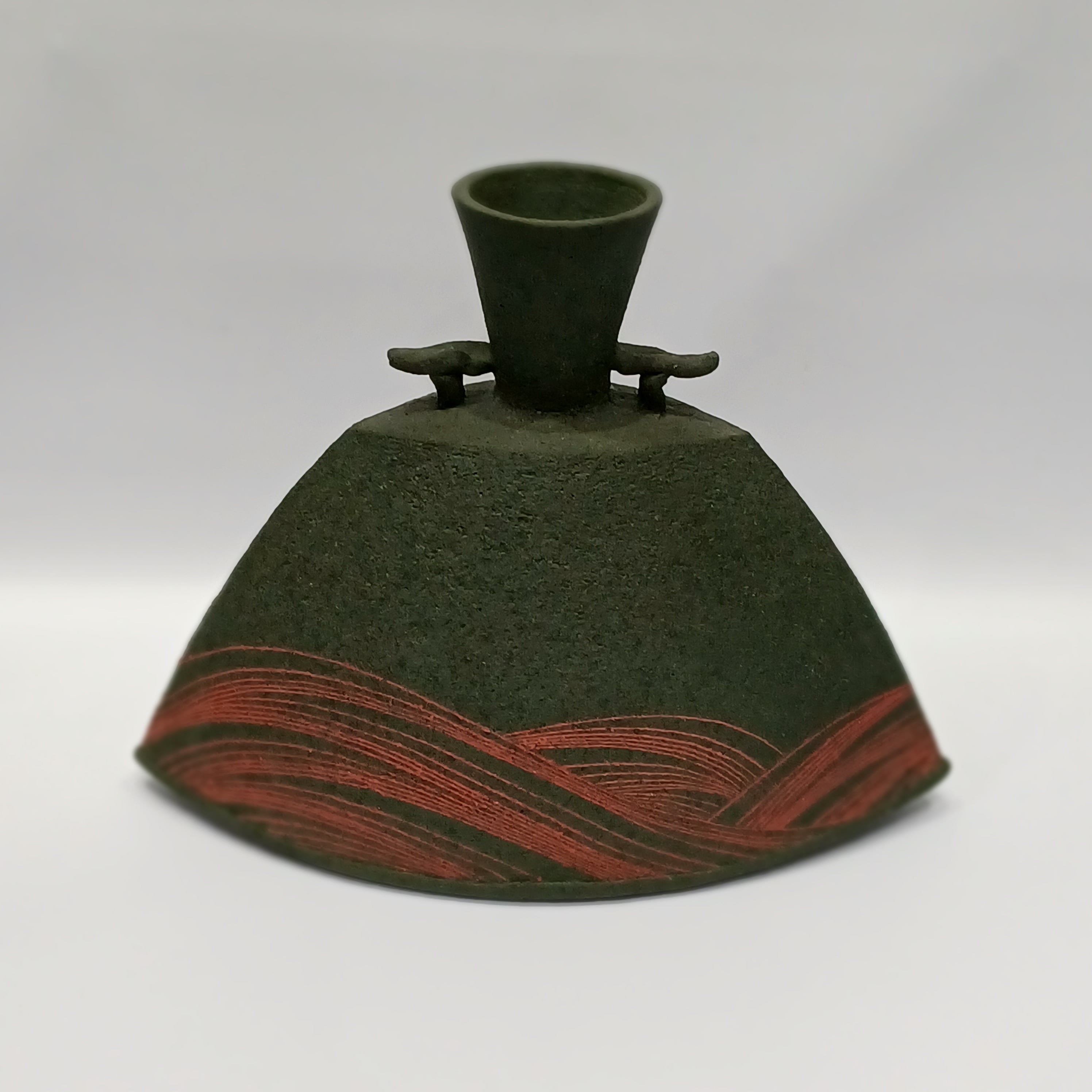 彩色化粧波線刻文花入は、萩焼の作家、上田敦之先生によるオリジナル作品です。全体に新しい緑釉を使用し、美しいグリーンが華やかに広がっています。下部には波線を刻み、赤い釉薬を入れて、躍動する波を表現しています。花を生けるのはもちろん、インテリアのアクセントとしてもおすすめです。