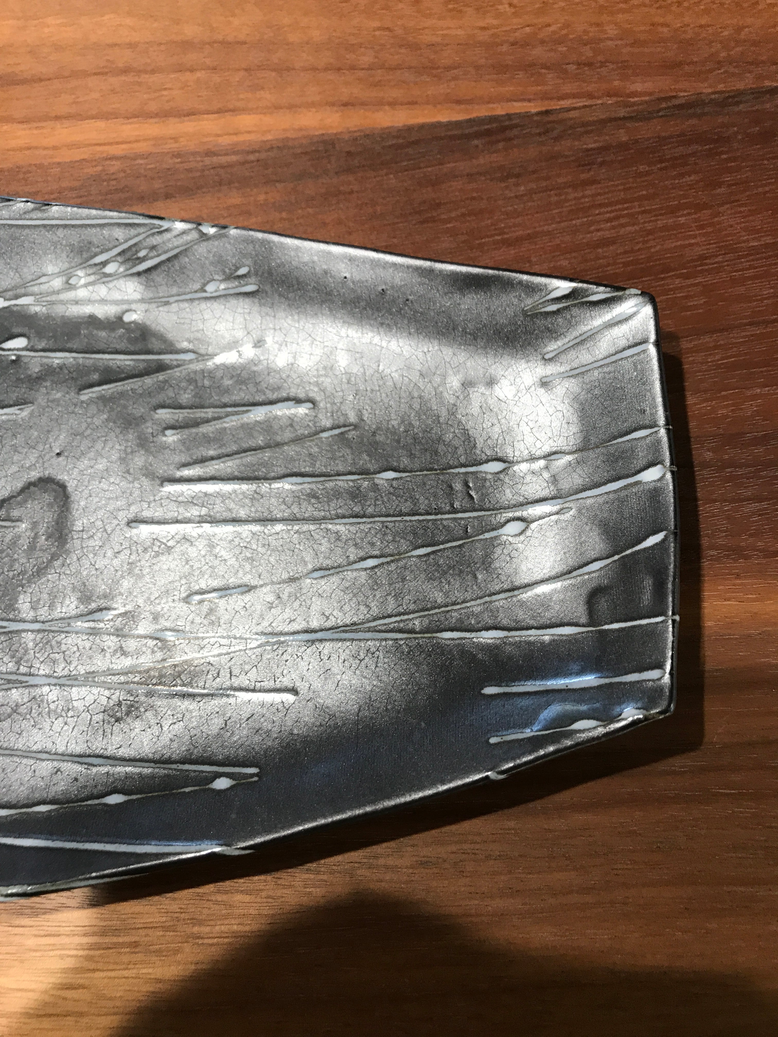黒いお皿に白いラインを不規則に入れアクセントに。