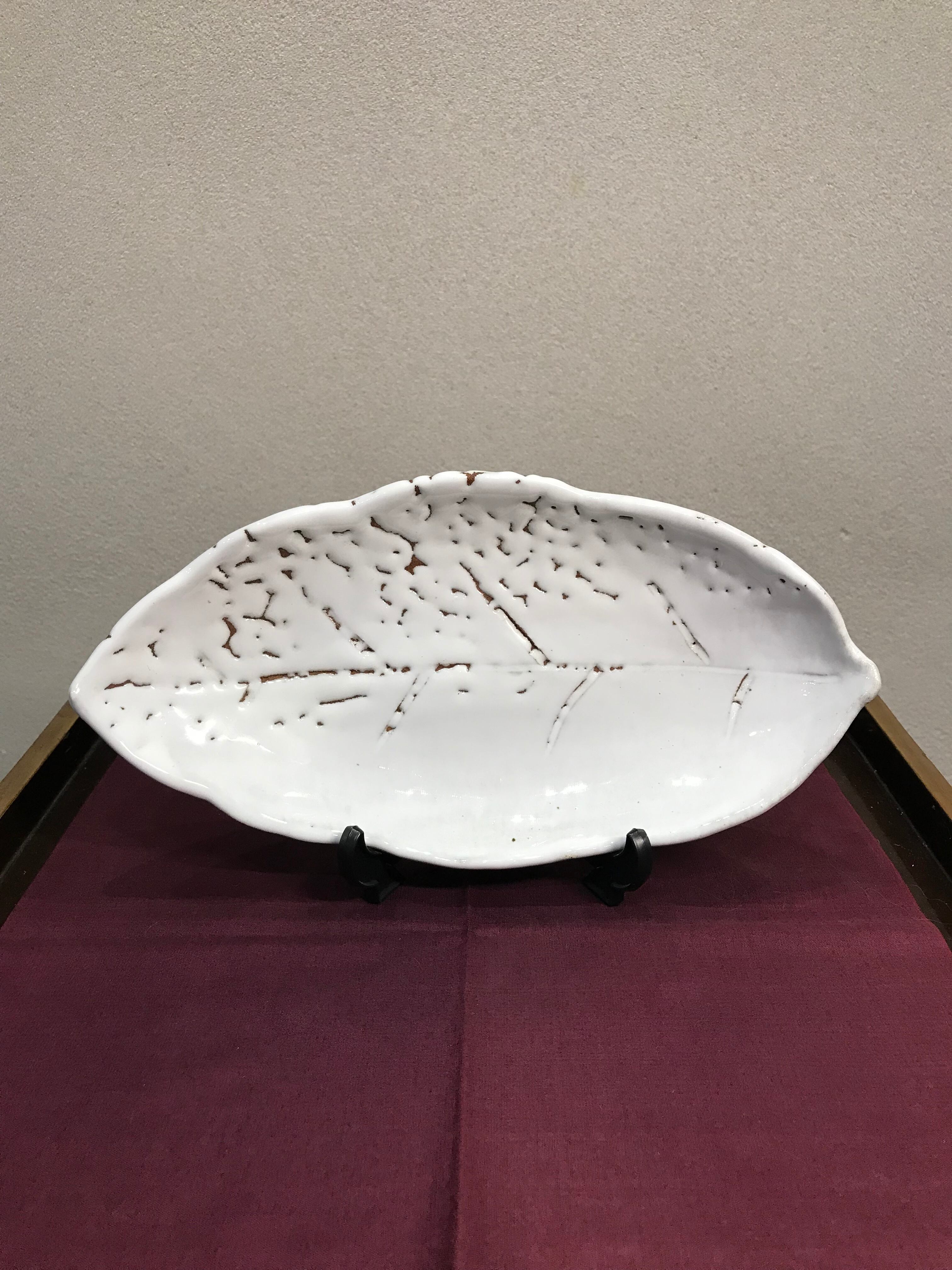 自然の木の葉をモチーフにした優美なフォルムと、やわらかな白釉に浮かぶ梅花皮(かいらぎ)の模様が、静かな存在感を放ちます。