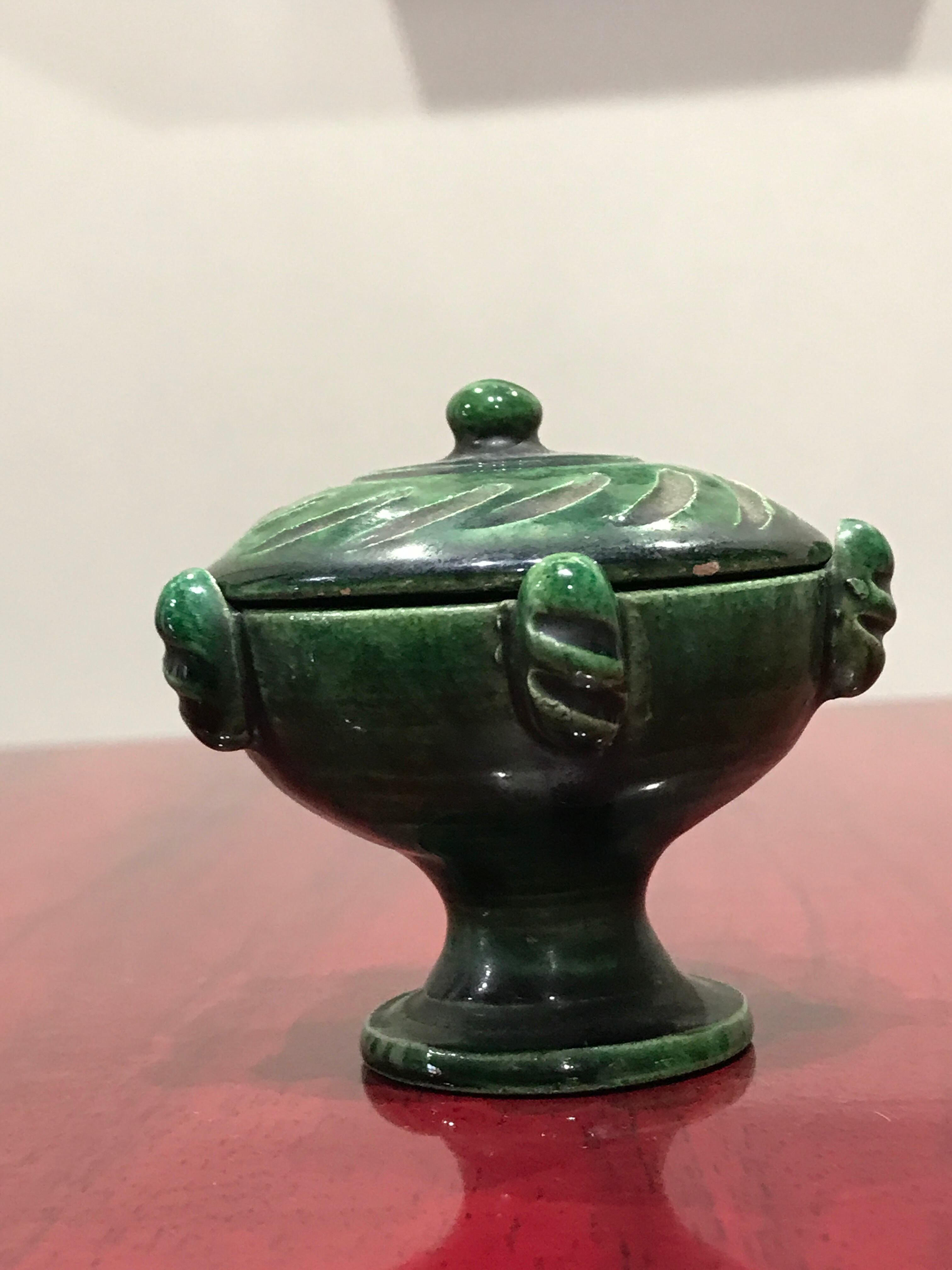 緑釉の風合いが美しい、蓋置き(香炉)です。高台裏には「楽の印」が刻まれ、独特の雰囲気を醸し出しています。真贋は判りませんが、お手元に置いていただいた方が、風情を愉しんでいただけると思います。