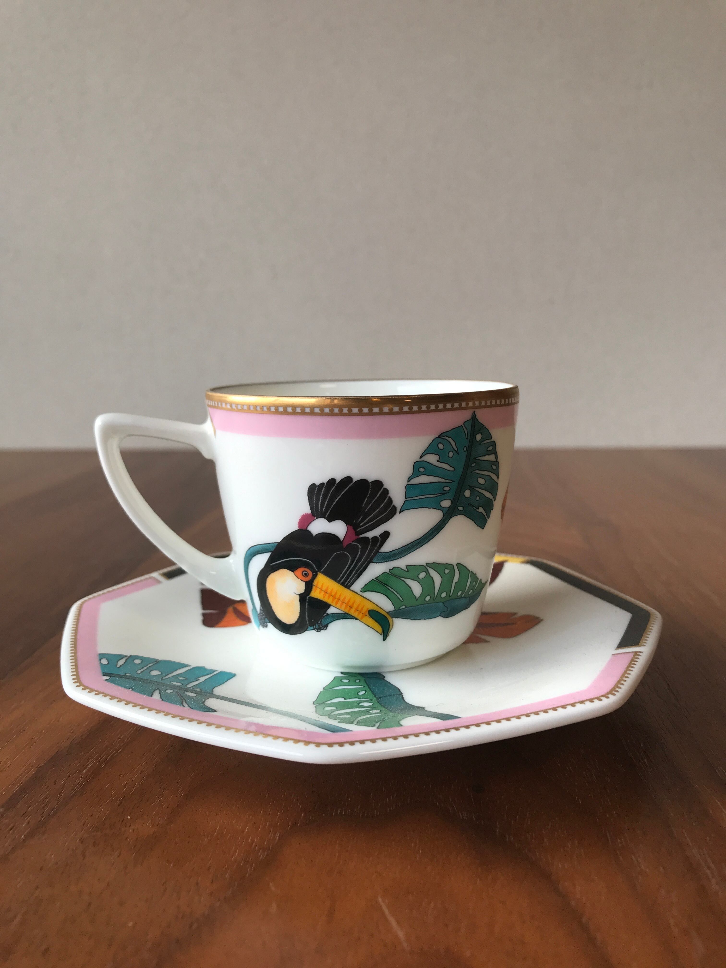 鮮やかな色彩で描かれたトロピカルバード「サイチョウ」の絵柄が印象的なデザイン。見た目の美しさだけでなく、使いやすさにも優れたカップは、朝のコーヒーや午後のティータイムに華やぎを添えてくれます。