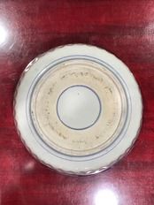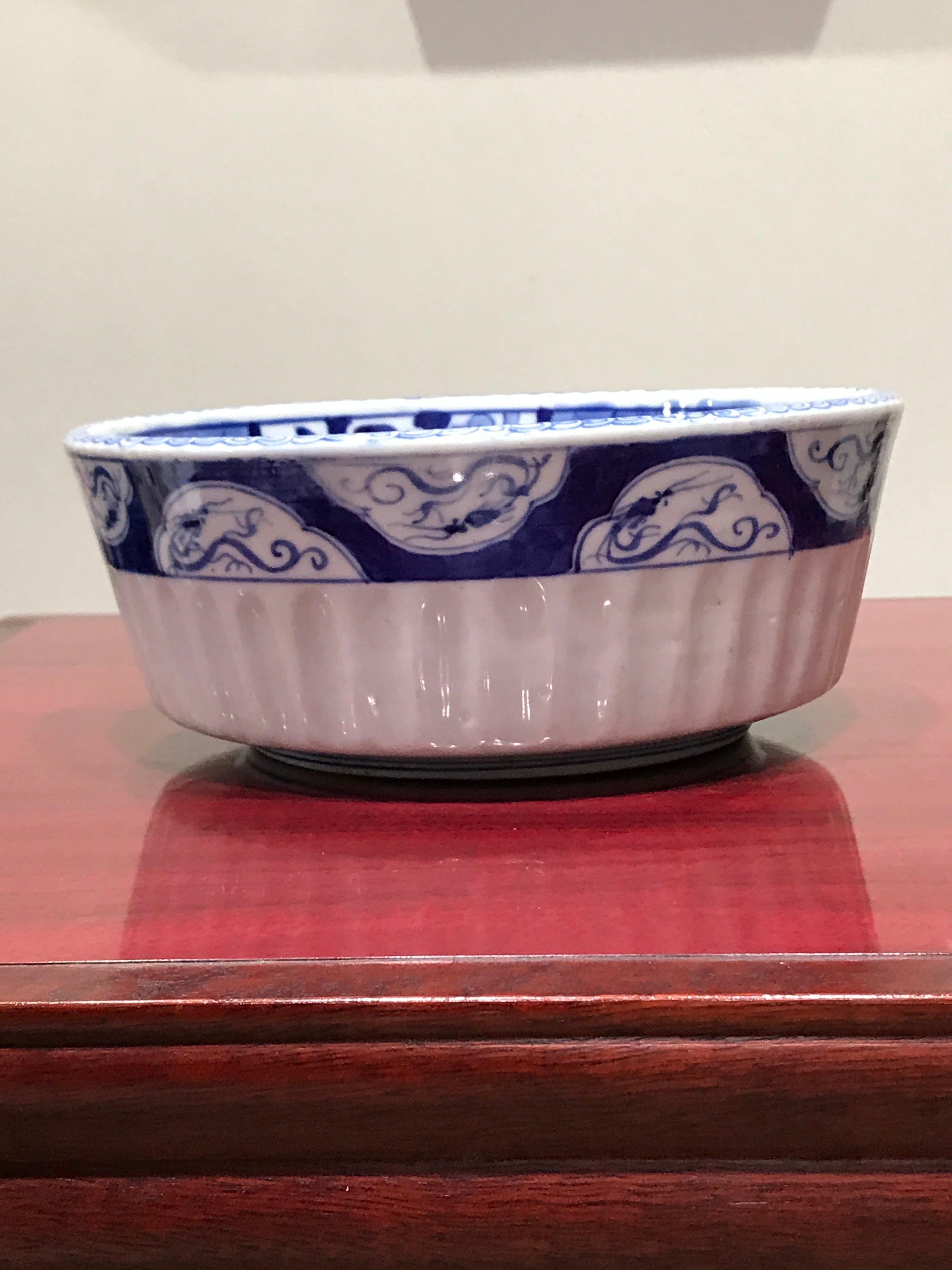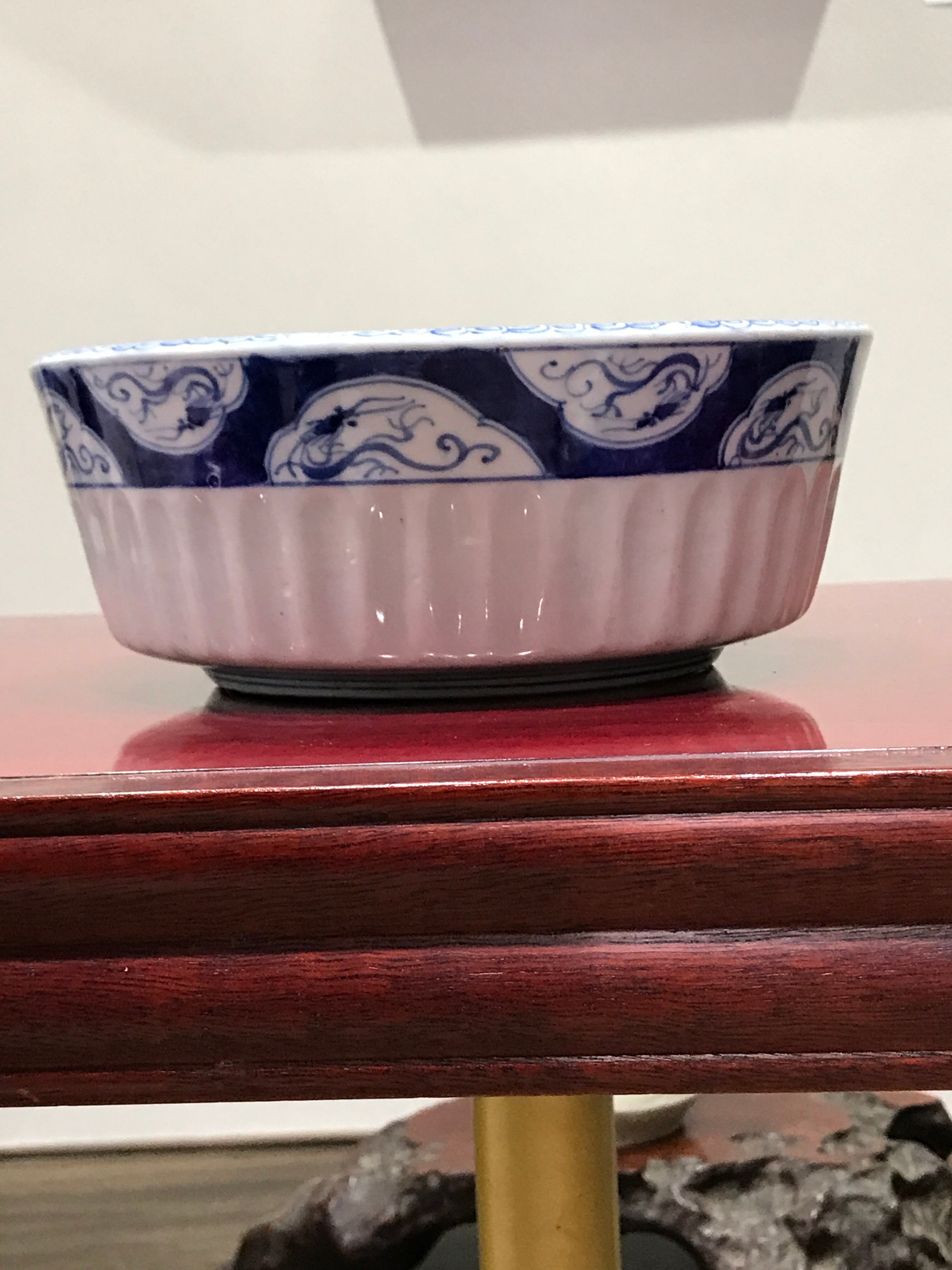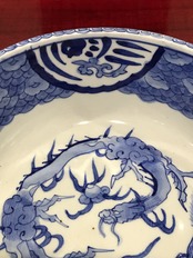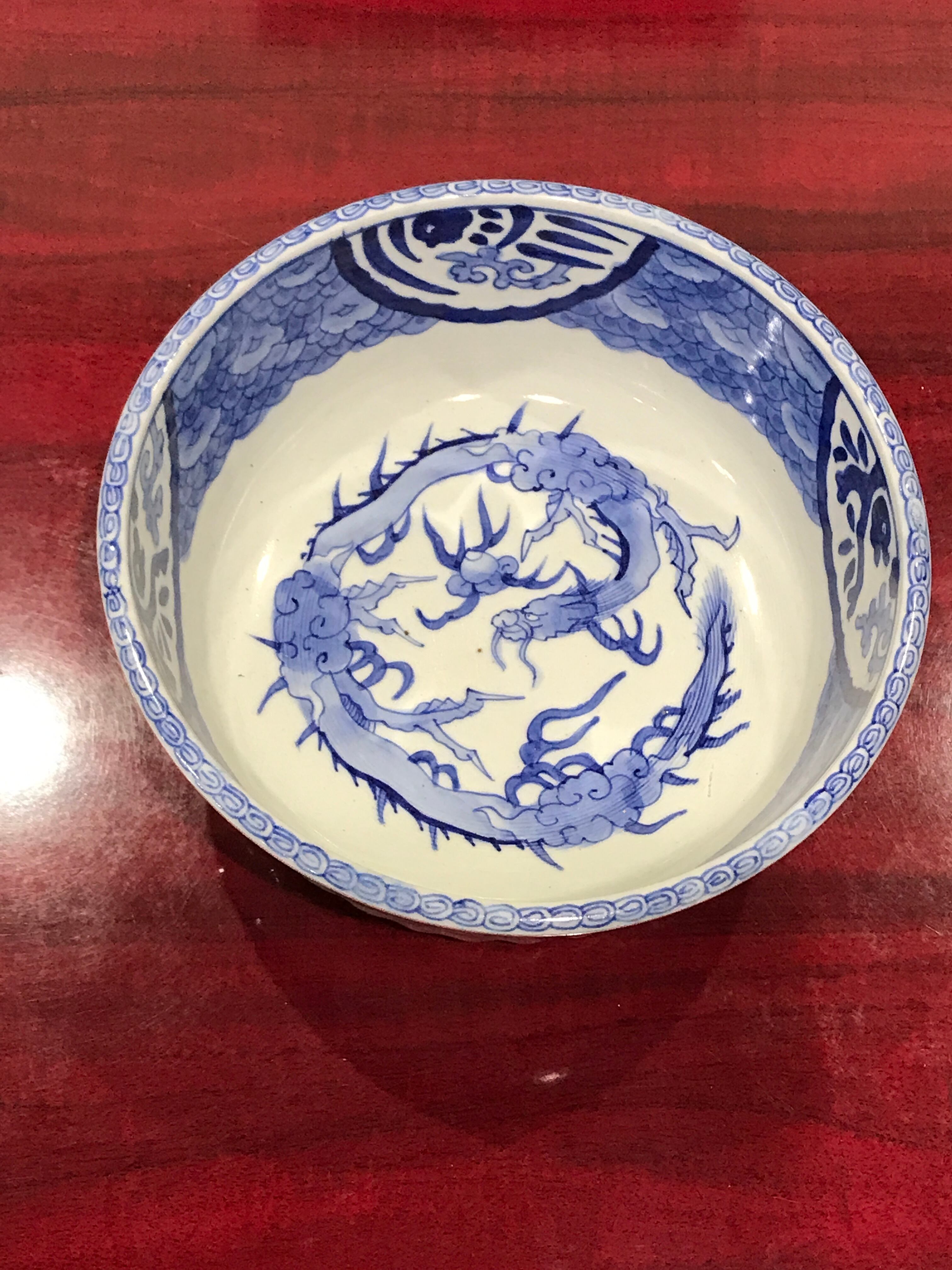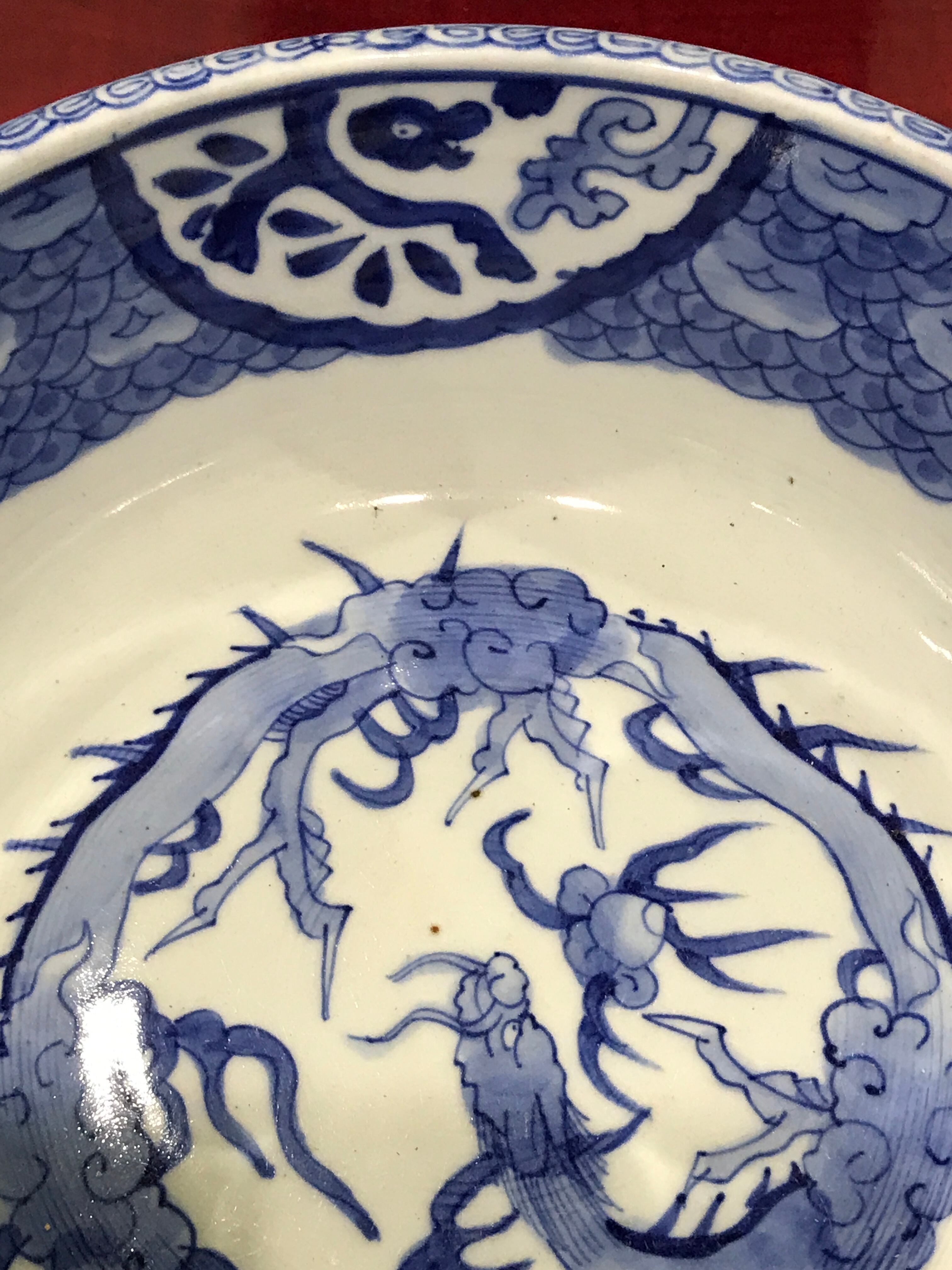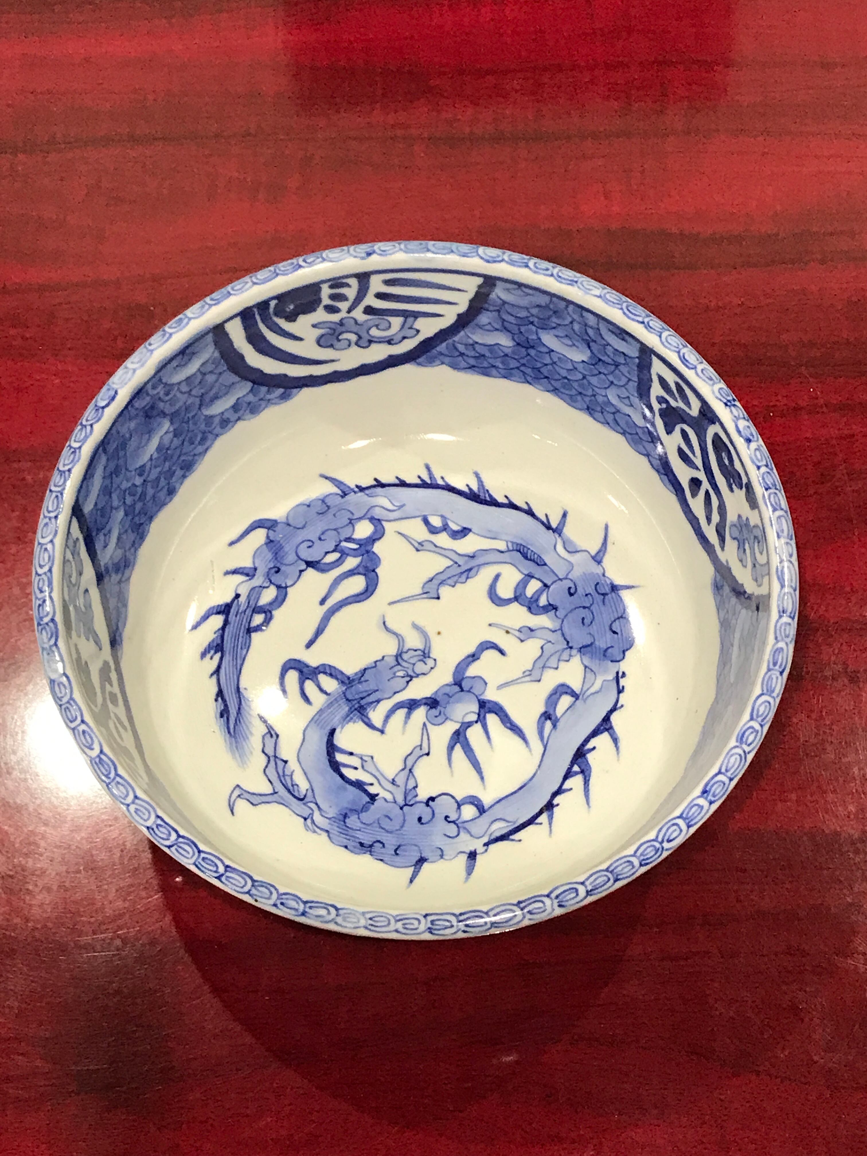 染付の大鉢です。宝珠の周りを龍が廻っている図です。口縁部には雲を巡らせ半円の窓に鳳凰、もう一つは不明です。鉢の外側は簡素化された龍文を巡らせています。高台は蛇目高台になっています。