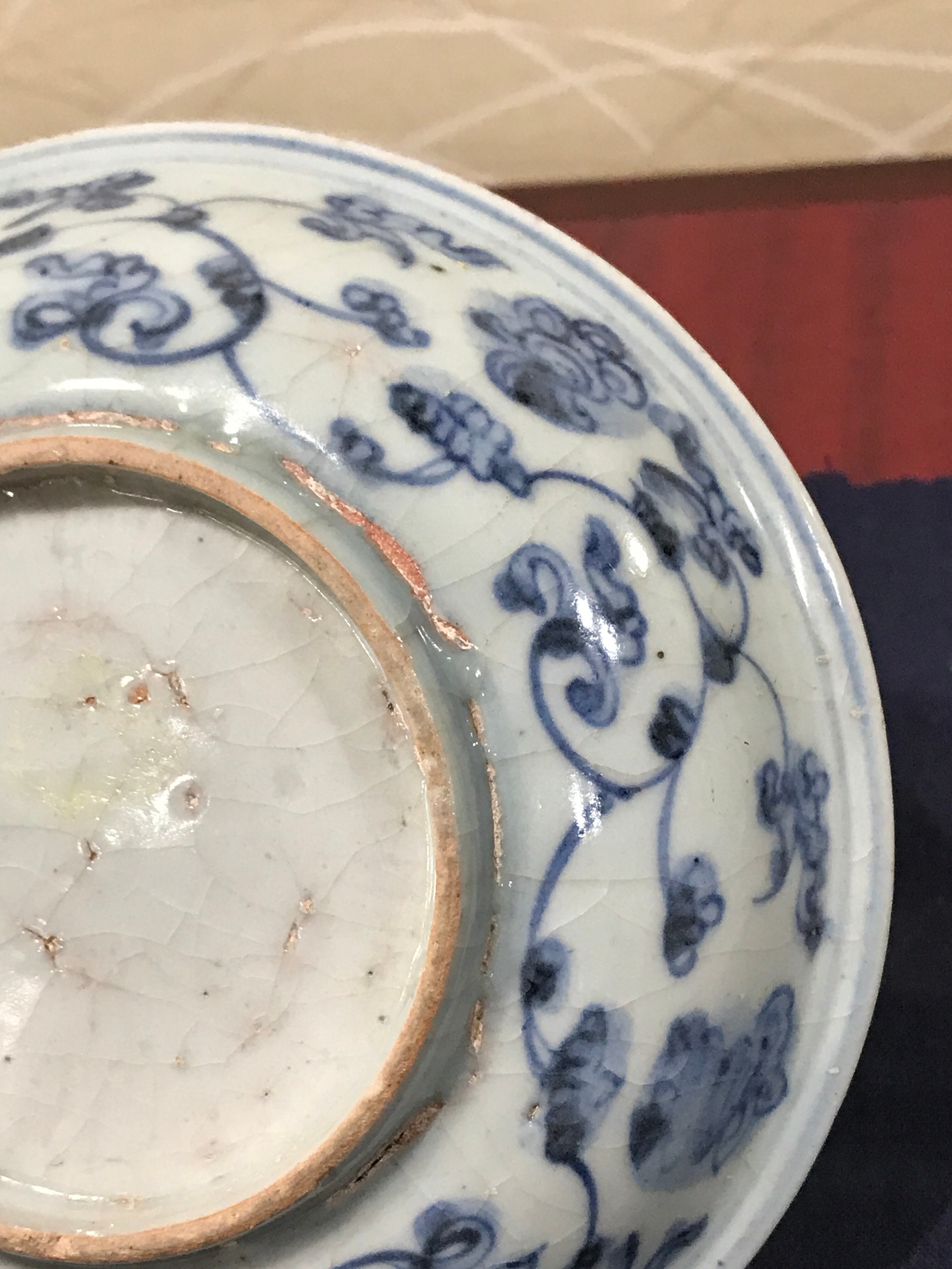 明治時代に生産された染付欄干樹木文皿です。直径15cm、高さ3.7cmの小ぶりなサイズながら、二重圏線の中央には太古石に花が咲いた植物が描かれ、左右には橋の欄干、真下には波濤が表現された、美しいデザインが特徴です。裏面には唐草模様が施されており、使わない時でも重宝する美しいデザイン性を持っています。