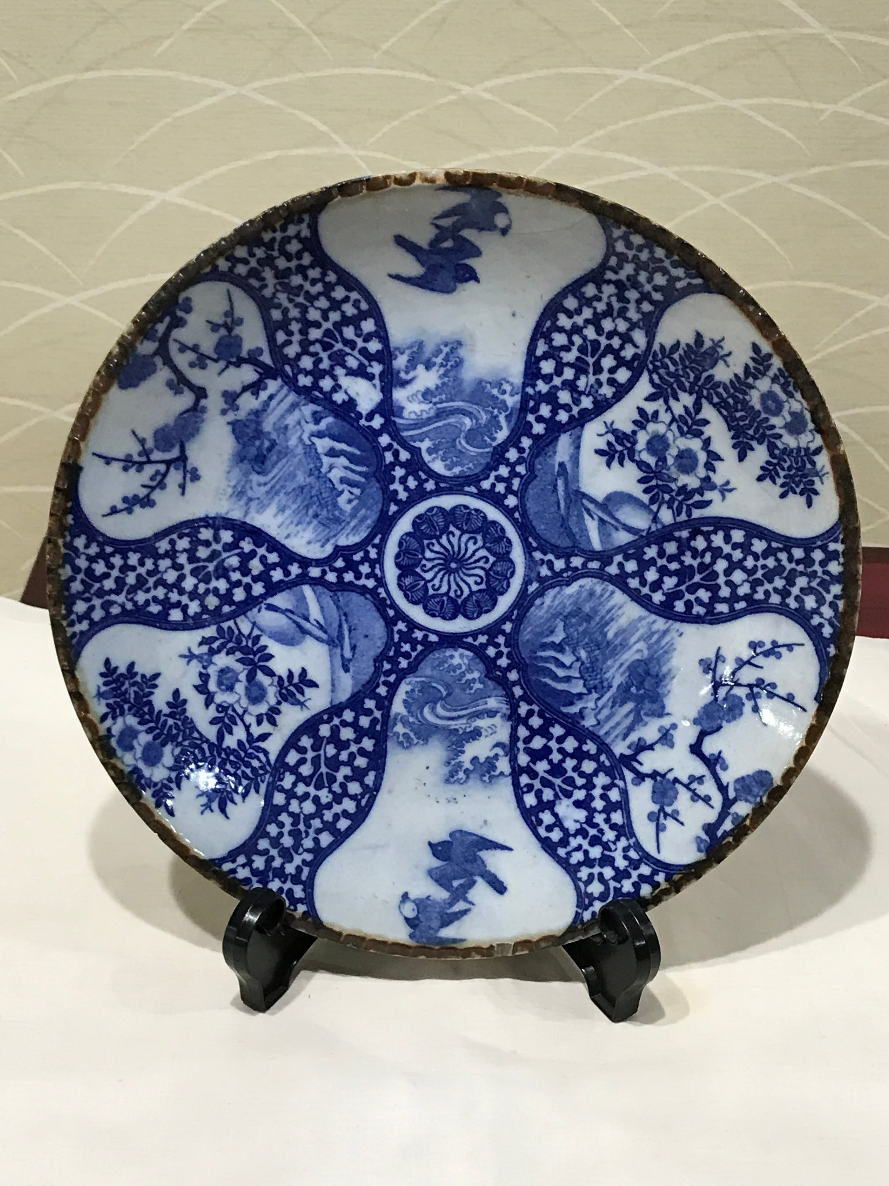 Japanese antique plate Copper plate transfer dyed swallow ayu pattern Ige plate Diameter 29cm Height 4.2cm