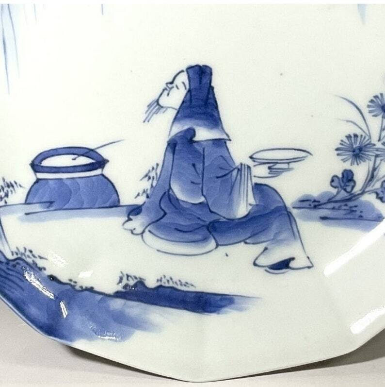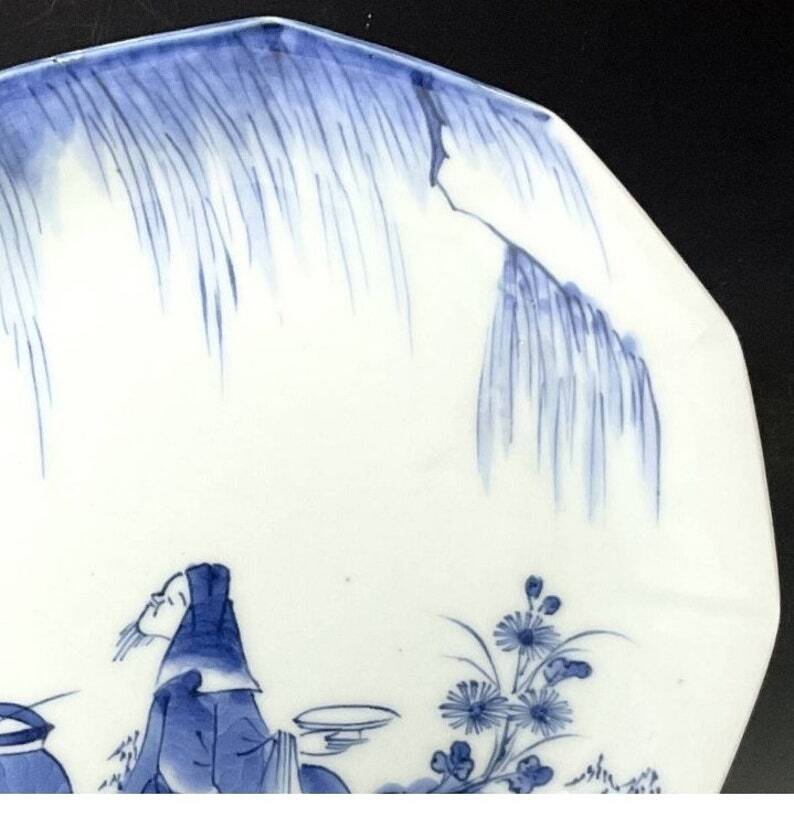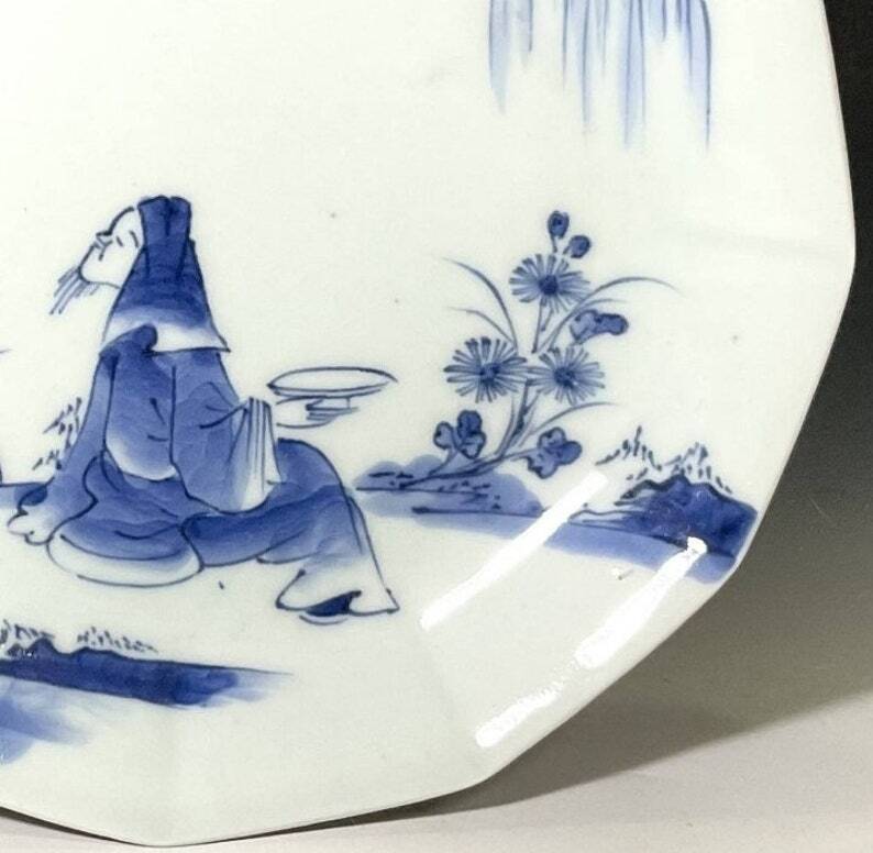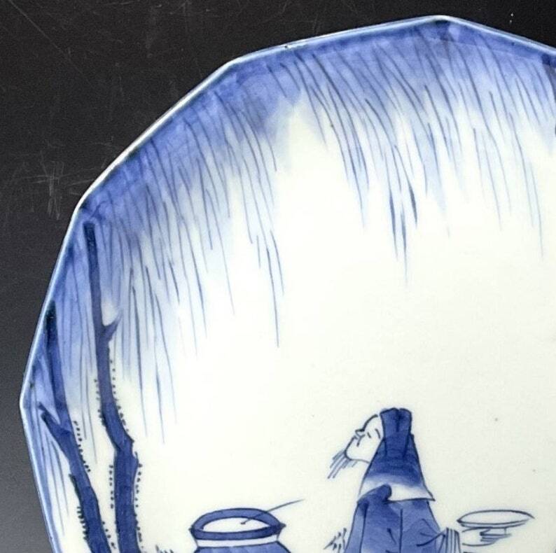 古伊万里の美しさを手軽にお楽しみ頂ける、染付のお皿ご紹介です。12角形の縁が優美な形状で、柳の木の下で粋人が花見酒を楽しんでいる図柄が描かれています。江戸時代後期、1830~1850年代頃に作られたものであり、幕末の手仕事による丁寧な作りが自慢の一枚です。