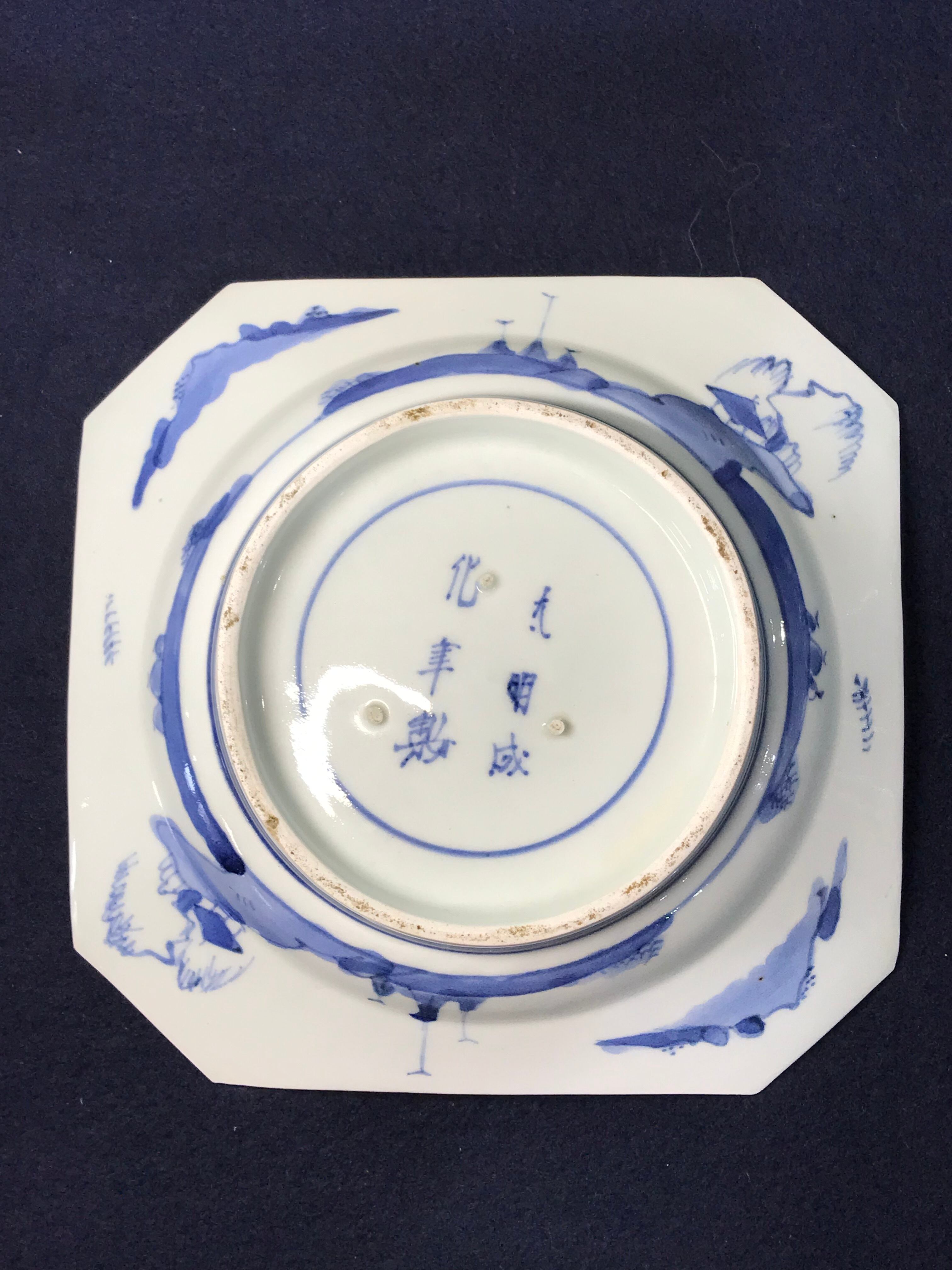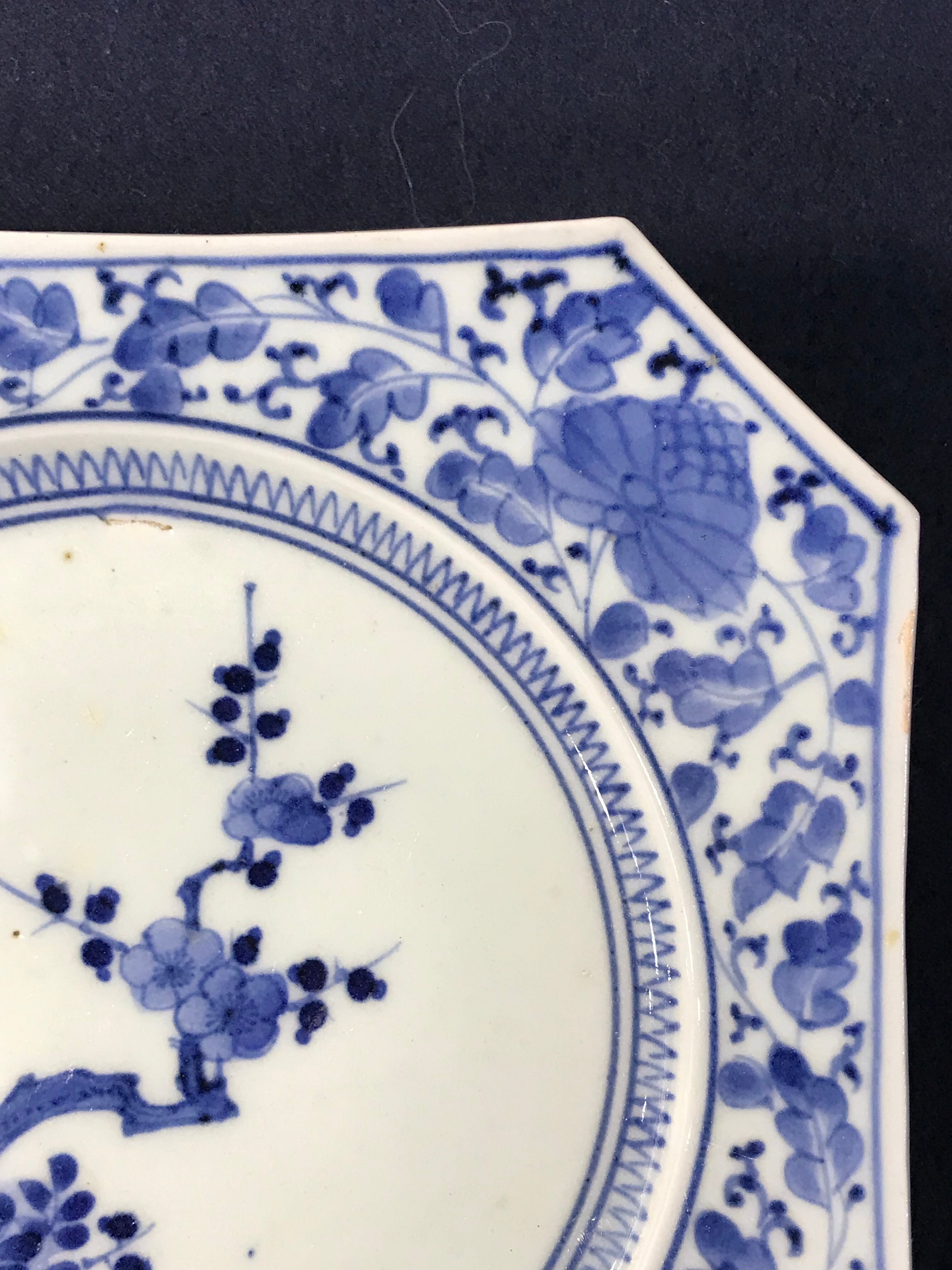江戸後期の伊万里染付花唐草梅文皿。美しい形状と深みのある隅切りデザインは、飾るだけでなく実際に使用しても喜ばれる角皿です。花唐草の人気デザインに、渋い梅の花が見込みに描かれ、花の周りの剣先も効果的に表現されています。花の美しさが引き立つ一品で、食卓や特別なシーンで使われた際に、ゲストや家族にも共感を与えることでしょう。
